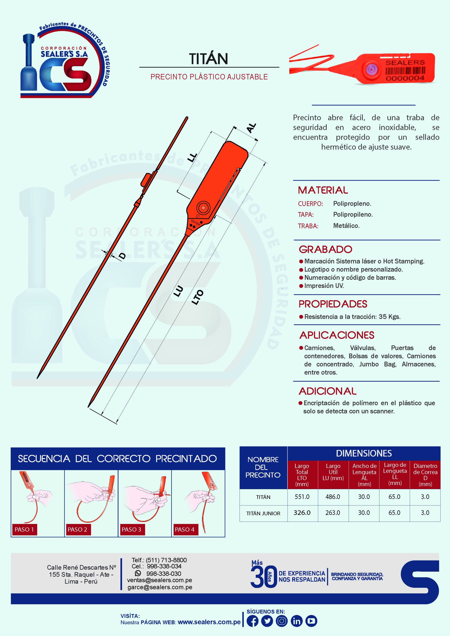 Precinto abre fácil, de una traba de seguridad en acero inoxidable, se encuentra protegido por un sellado hermético de ajuste suave.