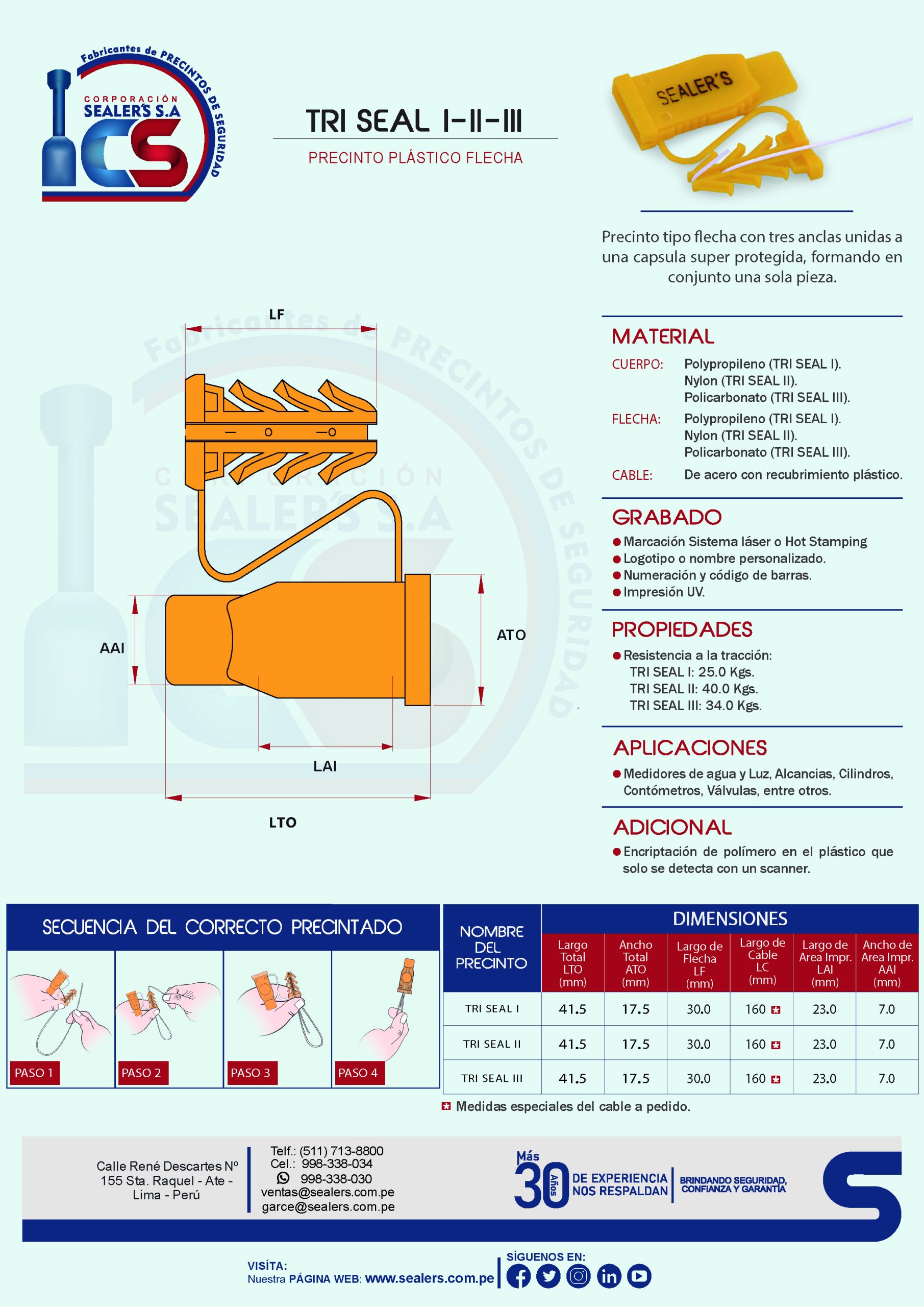 Precinto de seguridad tipo flecha. Lleva tres anclas unidas a una capsula que está formado en una sola pieza.