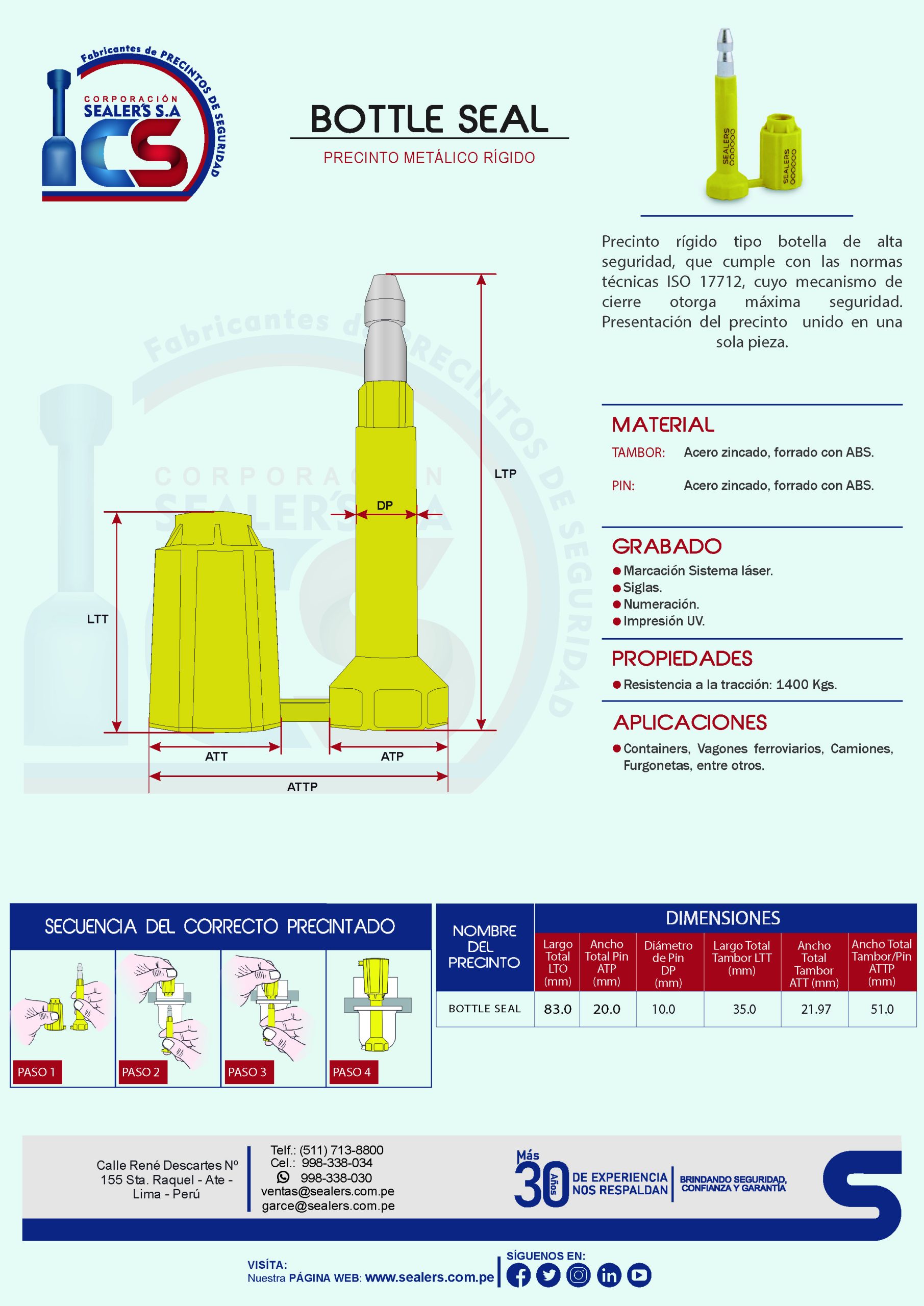 Precinto rígido de alta seguridad tipo botella. Cumple con las Normas técnicas ISO 17712. Su mecanismo de cierre otorga máxima seguridad bienes y valores.